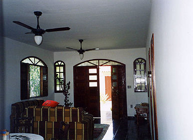 Blick auf den Wohnraum in Richtung Eingang. Alle Räume sind gefließt und haben einen Ventilator. Alle Fenster sind mit einem Mückennetz versehen.