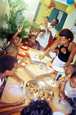 Zu allen besonderen Anlässen (hier: Weihnachten 2002) ist Hochbetrieb in der kleinen Küche. Pizza wird gebacken, Fleisch gebraten, Reis gekocht und Obst gereicht. Ein Essen, dass die meisten Kinder zu Hause noch nie gegessen haben.