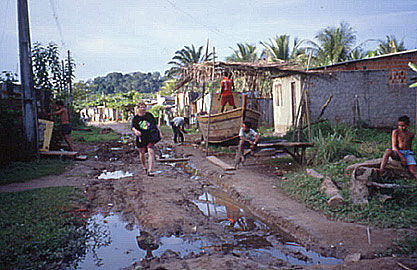 Holzhütten prägen das Bild. Nach einem Regenschauer stehen Straßen und Hütten unter Wasser. Brutstätte für viele Krankheiten.