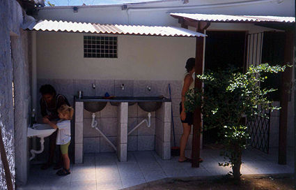 Überdachte, geflieste Waschplätze zum Spülen und Wäschewaschen. Auch Becken für die Kleinen, in erreichbarer Höhe, sind vorhanden.
